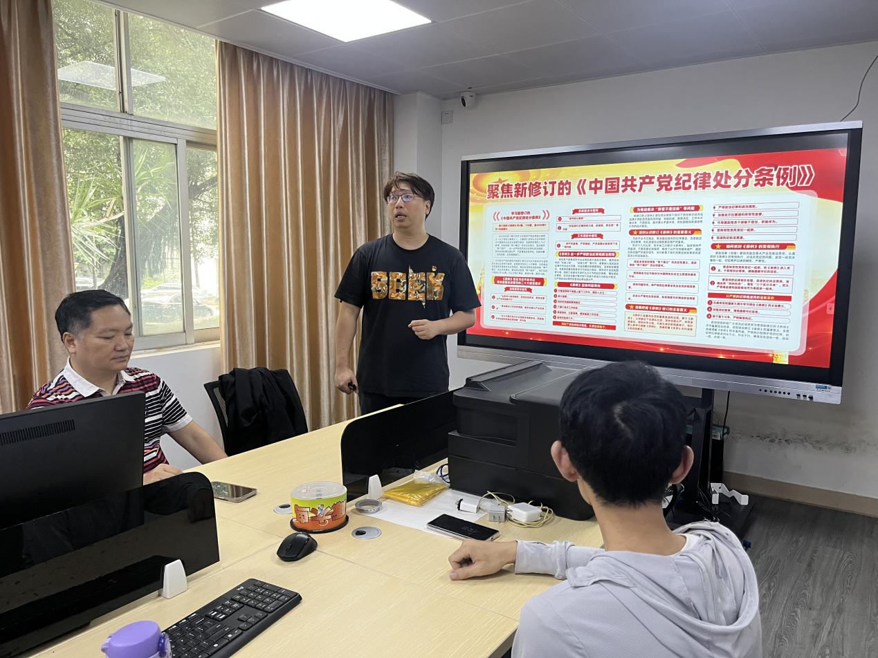 为进一步加强纪律教育、强化纪律意识,营造学纪、知纪、明纪、守纪的浓厚氛围,5月21日下午,计算机与信息工程学院第一党支部组织召开专题学习会议,深入学习《中国共产党纪律处分条例》(以下简称《条例》),支部全体成员参会。