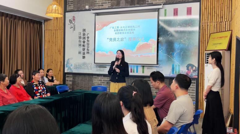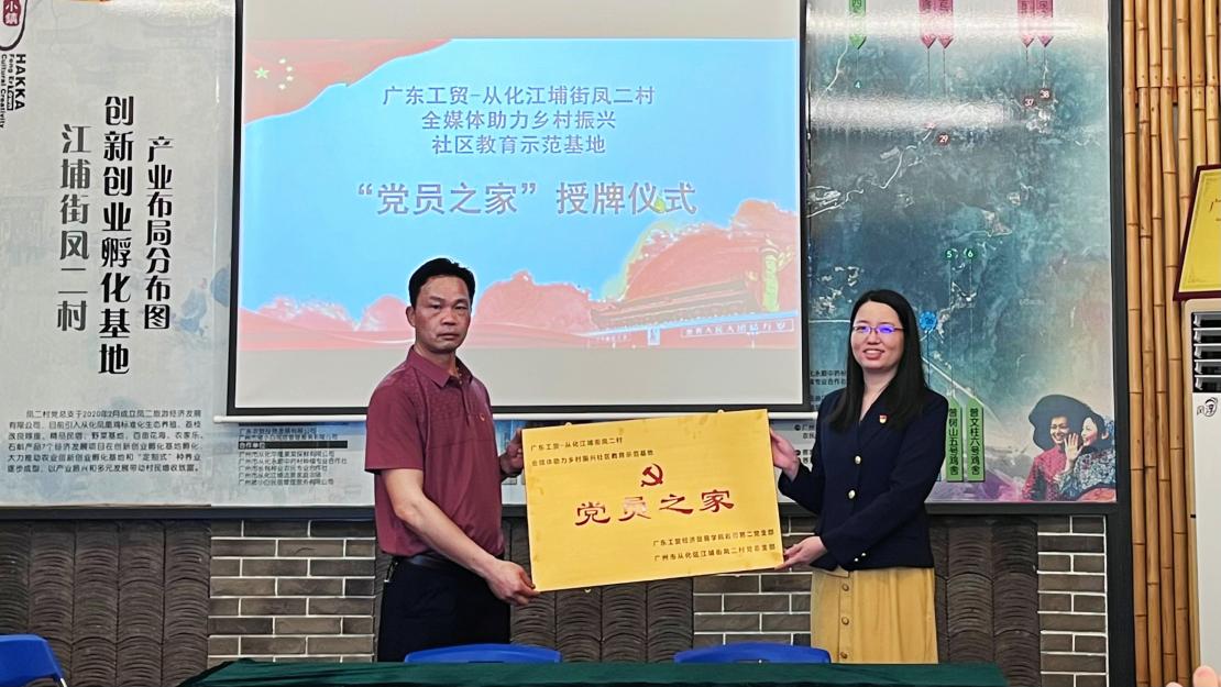 为落实广东省教育厅关于实施继续教育质量提升工程的通知,菲律宾亚星222官网经济贸易学院与从化江埔街凤二村共同创建全媒体助力乡村振兴社区教育示范基地。5月23日上午,广东工贸凤二村全媒体助力乡村振兴社区教育示范基地“党员之家”授牌仪式暨党建结对共建座谈在凤二村举行。会议由经贸学院教师张莉主持,经贸学院副院长蒋晶、凤二村第一书记李学超,凤二村党总支书记李铝平、凤二村党总支委员谢刘雨、经贸学院骨干教师黄诗媛、卢岩、陈秋娜、何志伟、辅导员李彩丽、学生党员、凤二村委、党员及村民共同参加。