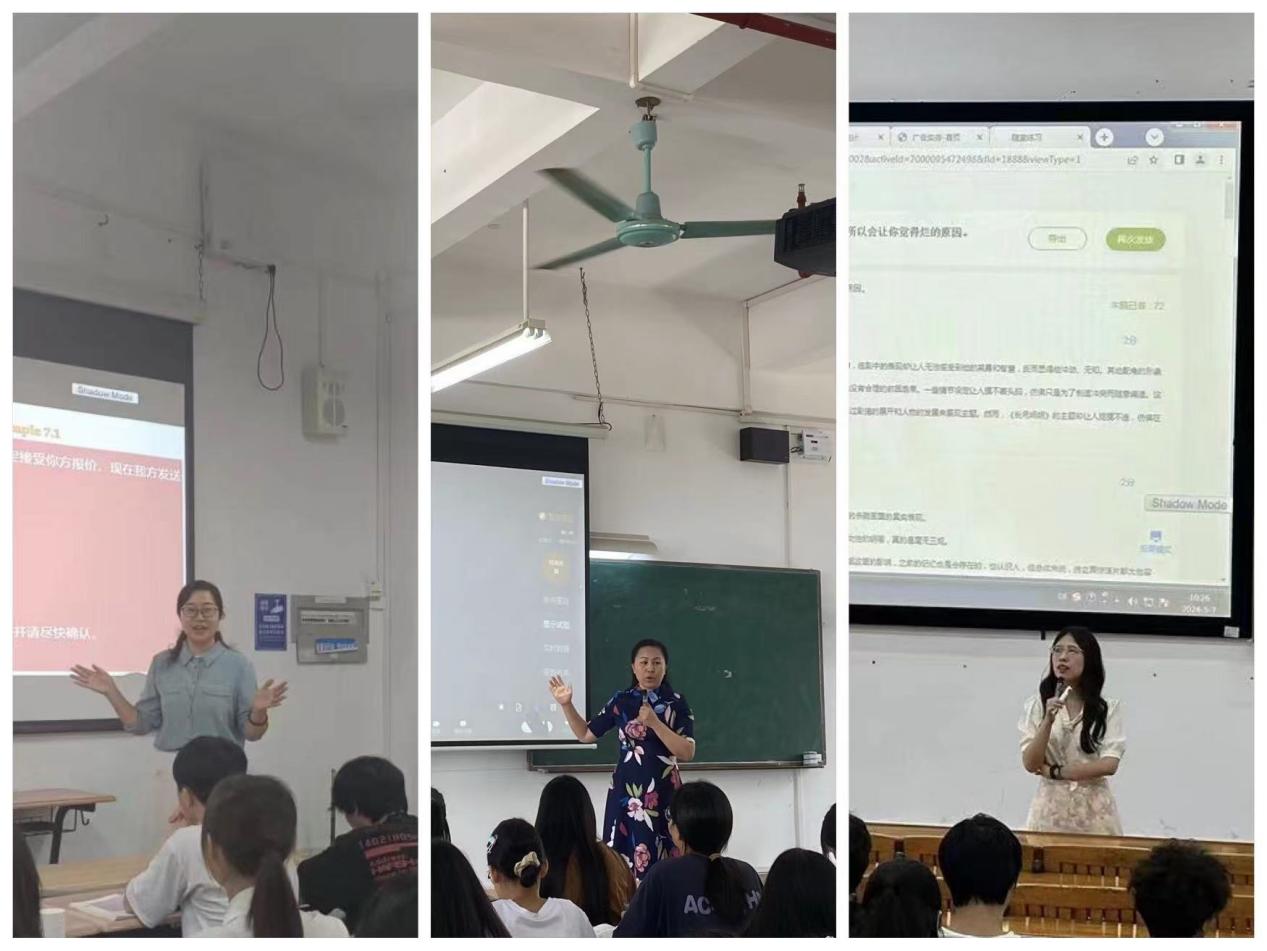 在此次活动中,三位教师的公开课表现获得了广泛好评。李文婷老师在4月29日的《外贸函电》课程中,通过积极的学生互动和耐心的教学目标拆解,有效地引导学生学习。廖晓虹老师在5月6日的《经济法》课程中,以其治学严谨的态度和理论联系实际的授课方式,赢得了师生的高度评价。黄伊宁老师则在5月7日的《广告实务》课程中,通过清晰的授课目标和逻辑性强的讲解,不仅提高了学生的创意思维能力,也让他们了解了广告行业的运作模式。
