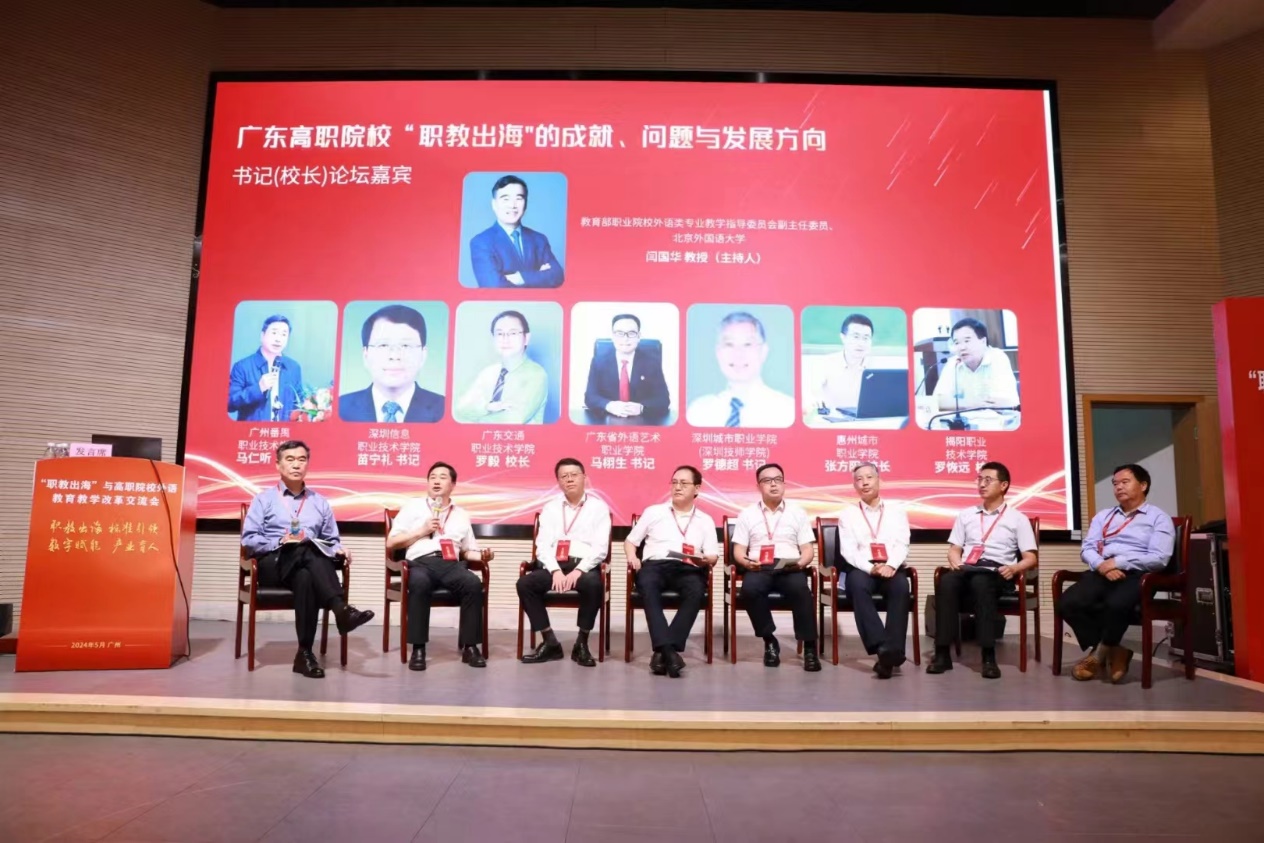 书记(校长)论坛由教育部职业院校外语类专业教学指导委员会副主任委员、北京外国语大学原副校长闫国华主持。广州番禺职业技术学院校长马仁听、深圳信息职业技术学院党委书记苗宁礼、广东交通职业技术学院校长罗毅、广东省外语艺术职业学院党委书记马栩生、深圳城市职业学院(深圳技师学院)党委书记罗德超、惠州城市职业学院校长张方阳、揭阳职业技术学院校长罗恢远围绕广东高职院校“职教出海”的成就、问题与发展方向进行深入交流。