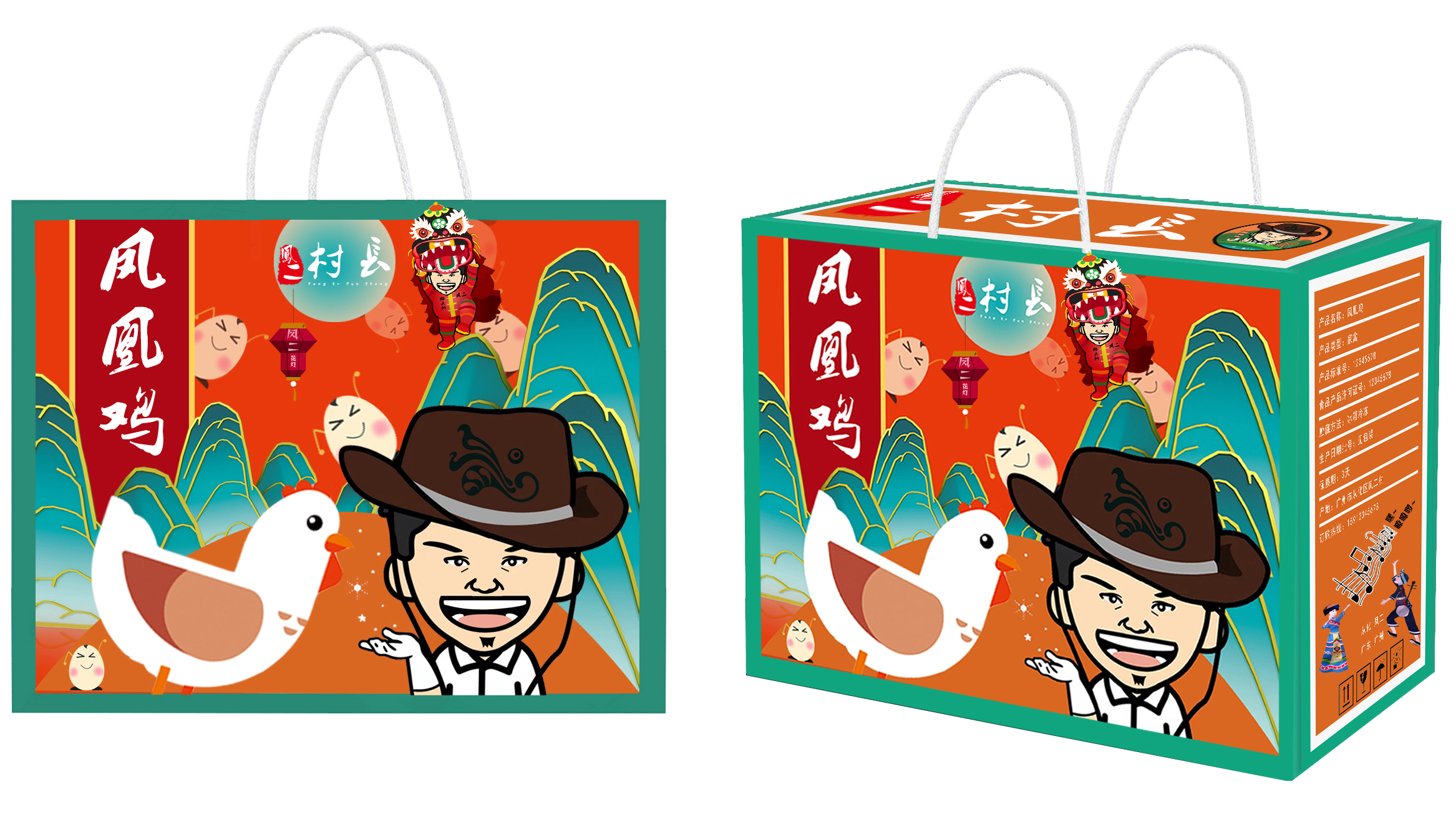 “凤二村长”品牌商标以及两款包装盒的总体设计思路是与以凤二村党总支部书记、凤二村村主任李铝平为原型打造的动漫IP形象结合来设计手绘插画非遗文创主图形,并基于凤二村特色产业将主图形应用于食品包装,专利号为ZL 2023 3 0366403.8,名称为“食品包装盒(凤凰鸡)”的外观设计专利,以及登记号为国作登字-2023-F-00136381,名称为“凤二村长”的美术作品著作权授权广州市凤二村旅游经济发展有限公司在一定范围内使用。此项专利展现了凤二村风景如画的自然风光、凤凰鸡优越的养殖环境和客家人崇尚自由、崇文重教的个性特点,充分运用客家非遗文创+动漫IP品牌商标和食品包装盒能为乡村产业发展加油助力。