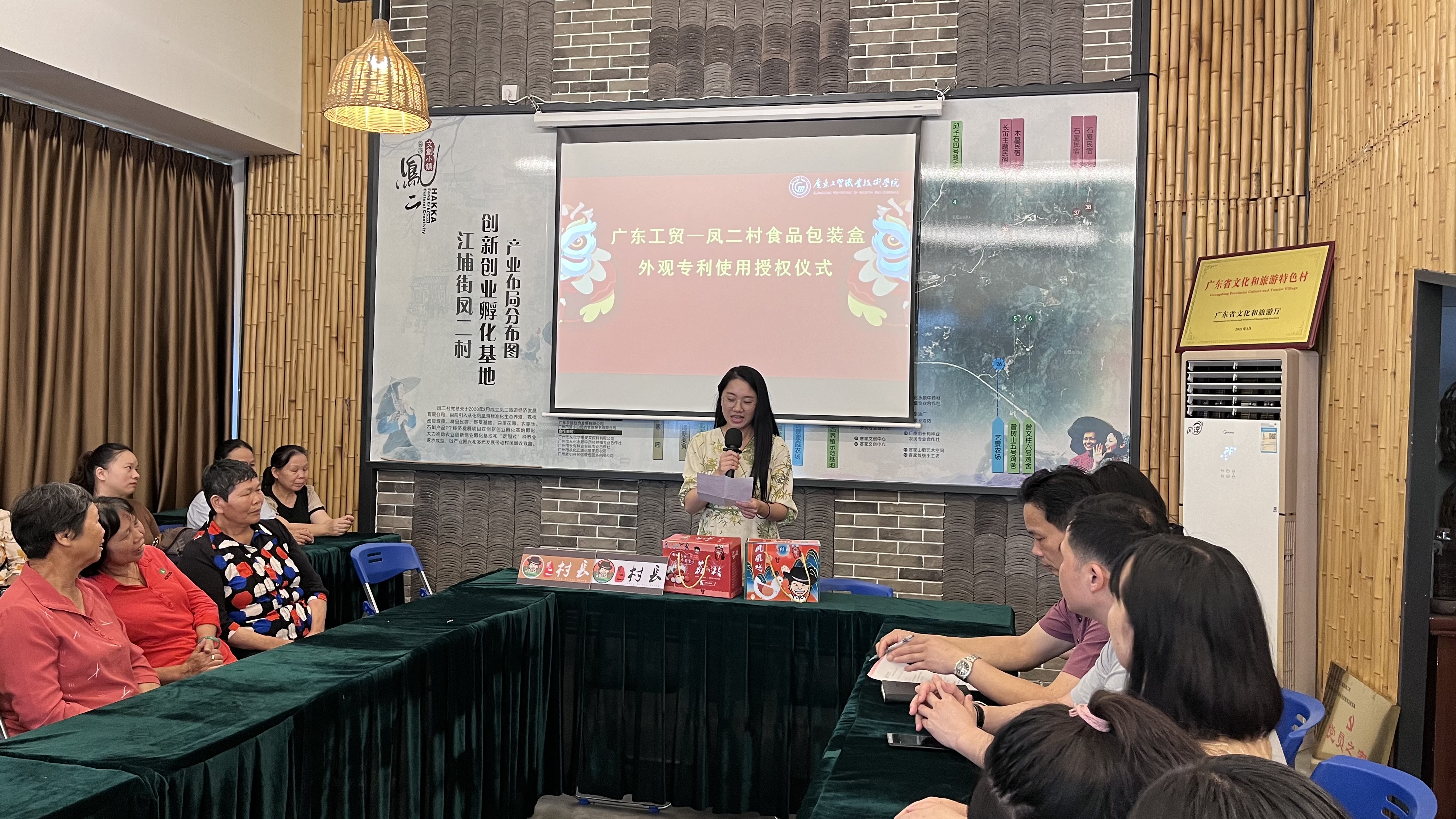 党建引领,助力乡村振兴。为提升从化江浦街凤二村农副产品品牌塑造,开拓凤二村农副产品运营新商业模式,黄诗媛老师与艺术教育学院潘欢老师为凤二村共同设计“凤二村长”品牌商标、“凤凰鸡”食品包装盒、“荔枝”食品包装盒。5月23日上午,经济贸易学院教师第二党支部党员与凤二村村委及村民共同举行“凤二村长LOGO”、凤凰鸡包装专利授权仪式,此举创新乡村振兴方式,促进了凤二村农副产品跨界动漫发展新模式,改变以往零散的帮扶做法,立足实际,精准帮扶到点子上,开阔精准帮扶新空间。