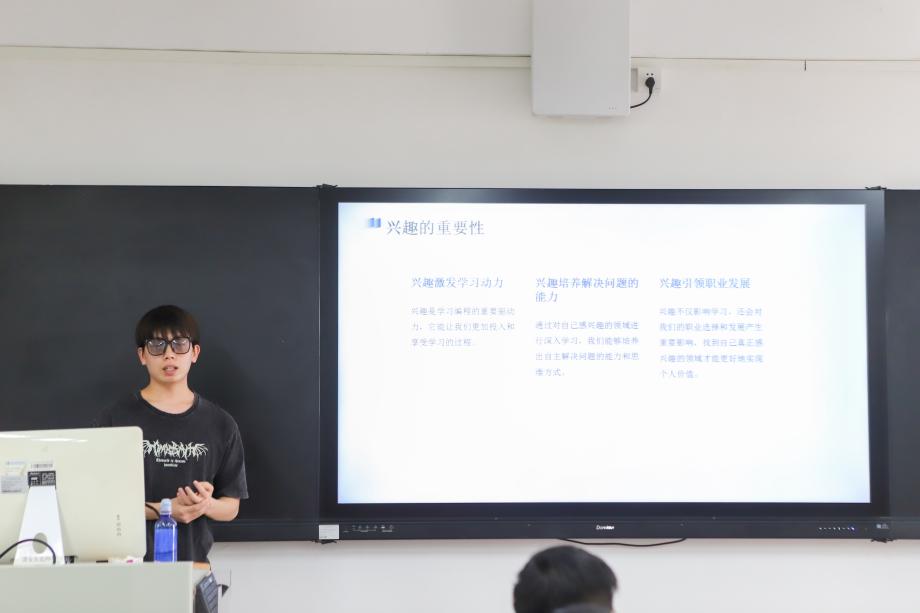 随后,21级软件技术专业的朋辈导生,多次国家奖学金获得者郑泽铨同学为大家做了学习经验交流分享。他与同学们交流了兴趣在学习中的重要性,分享了培养学习兴趣的方法,推荐了多个软件专业学习资源平台,并现场举例演示了使用的方法,还通过讲述身边同学真实求职的经历让大家体会到当下的就业压力,极大的激发同学们的学习动力。