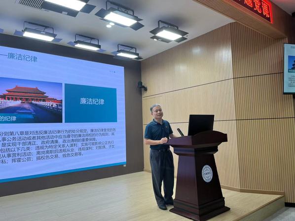 课上,速云中同志以《学纪律明规矩守廉洁》为题,从开展党纪学习教育的重大意义、全面加强党的纪律建设、廉洁从教立师德等多个方面进行阐述。授课主旨鲜明、内容丰富,教育引导学院全体教师党员进一步增强党纪意识,筑牢思想防线,增强敬畏之心。坚守“六大纪律”的底线自觉,严守政治纪律,忠诚担当;严守组织纪律,团结协作;严守廉洁纪律,清白为人;严守工作纪律,勤勉尽责;严守群众纪律,牢记初心使命;严守生活纪律,涵养正气。特别提到教师党员要明确师德底线,坚定政治方向、自觉爱国守法、传播优秀文化、潜心教书育人、关心爱护学生、坚持言行雅正、遵守学术规范、秉持公平诚信、坚守廉洁自律、积极奉献社会。要真正把《中国共产党纪律处分条例》学深悟透、融会贯通,内化于心、外化于行,切实将学习成果转化为坚定信仰、锤炼党性、指导实践、推动学院事业高质量发展的强大力量。