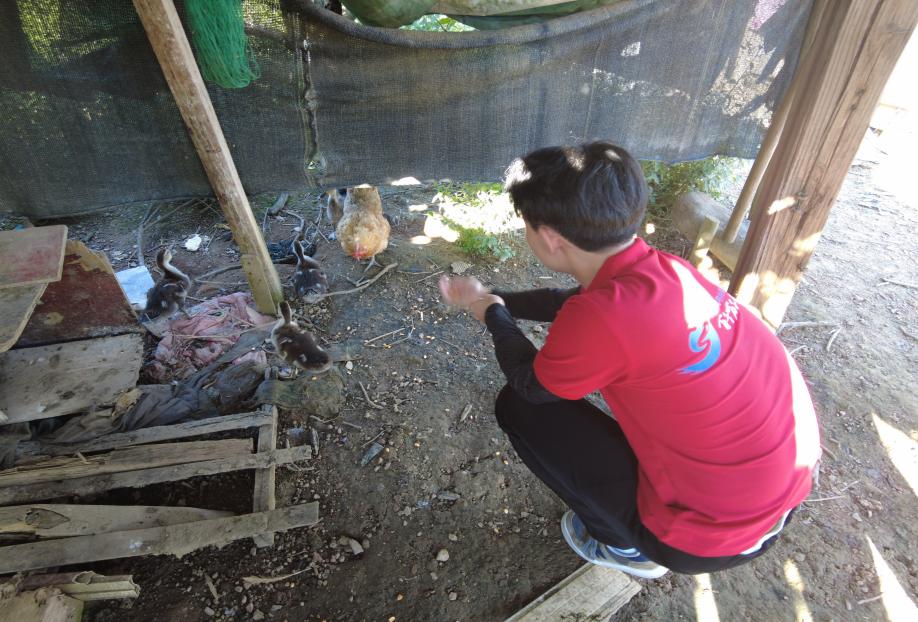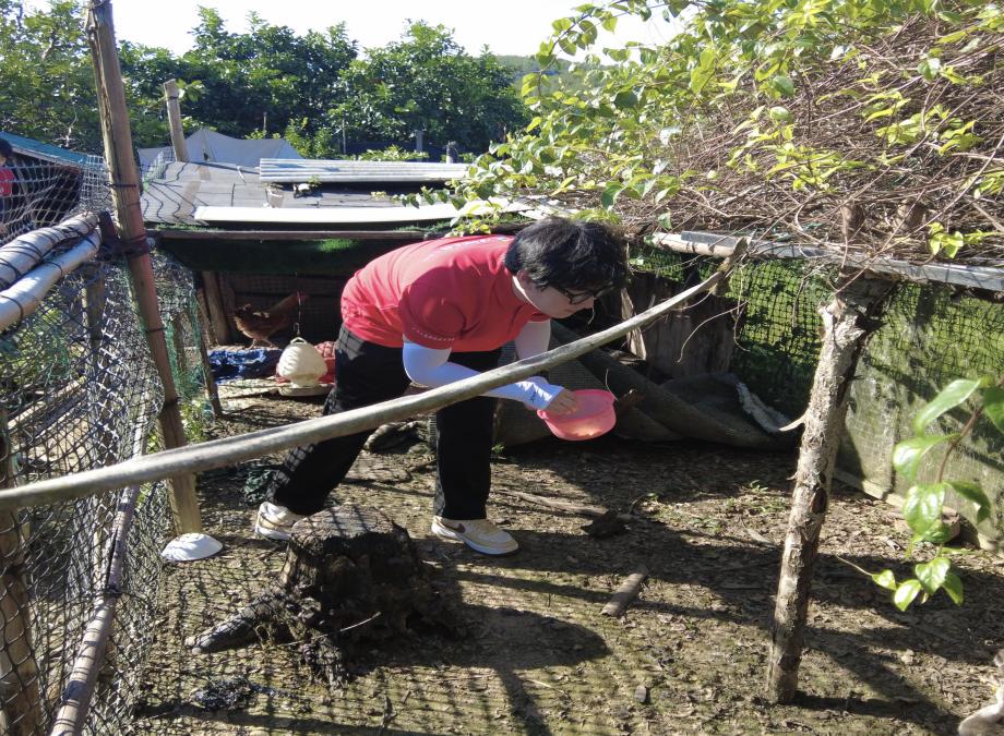 突击队成员帮助村里孤寡老人喂鸡喂鸭