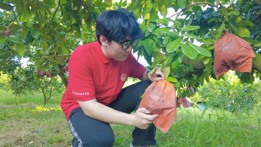 突击队成员在沙田柚种植基地给柚子“穿衣”