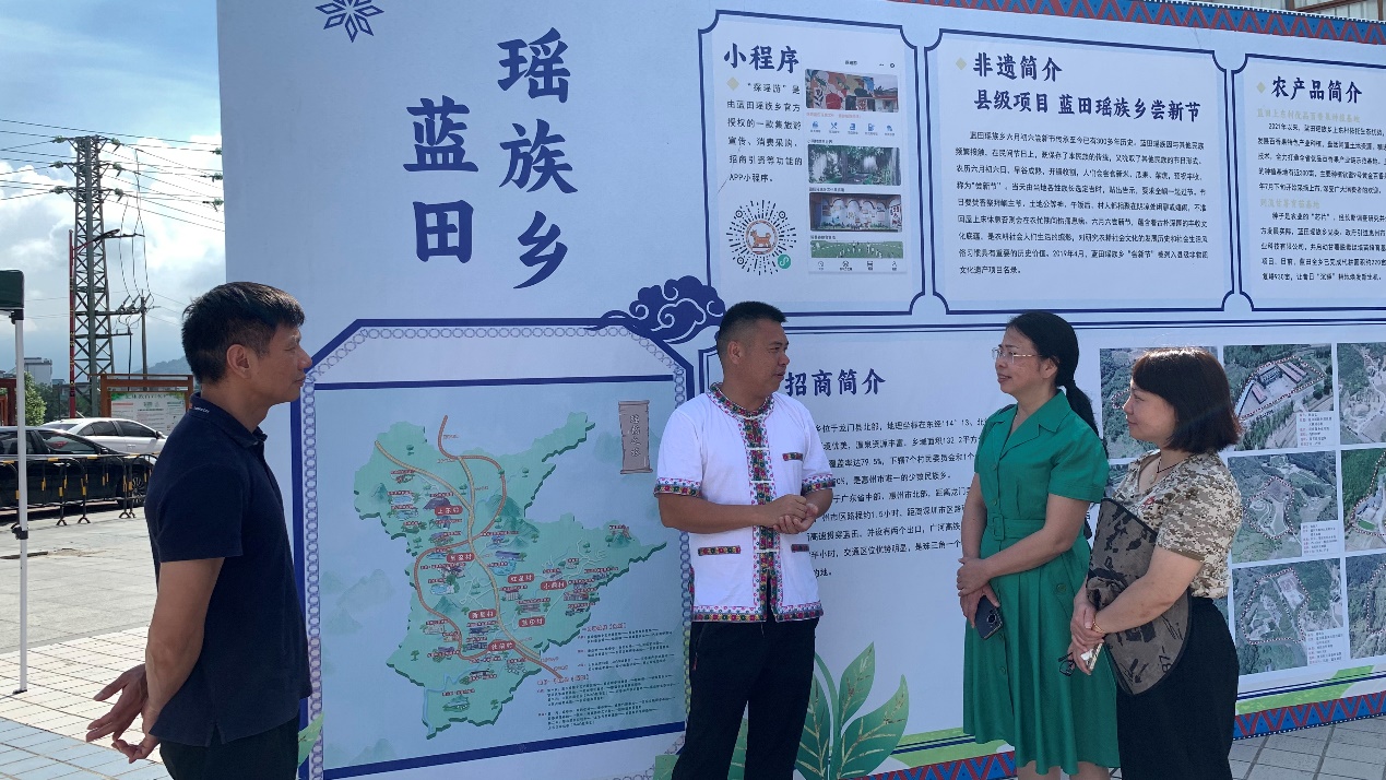 蓝田瑶族乡企业代表孙威威为彭枚芳、罗春科讲解蓝田瑶族乡旅游线路