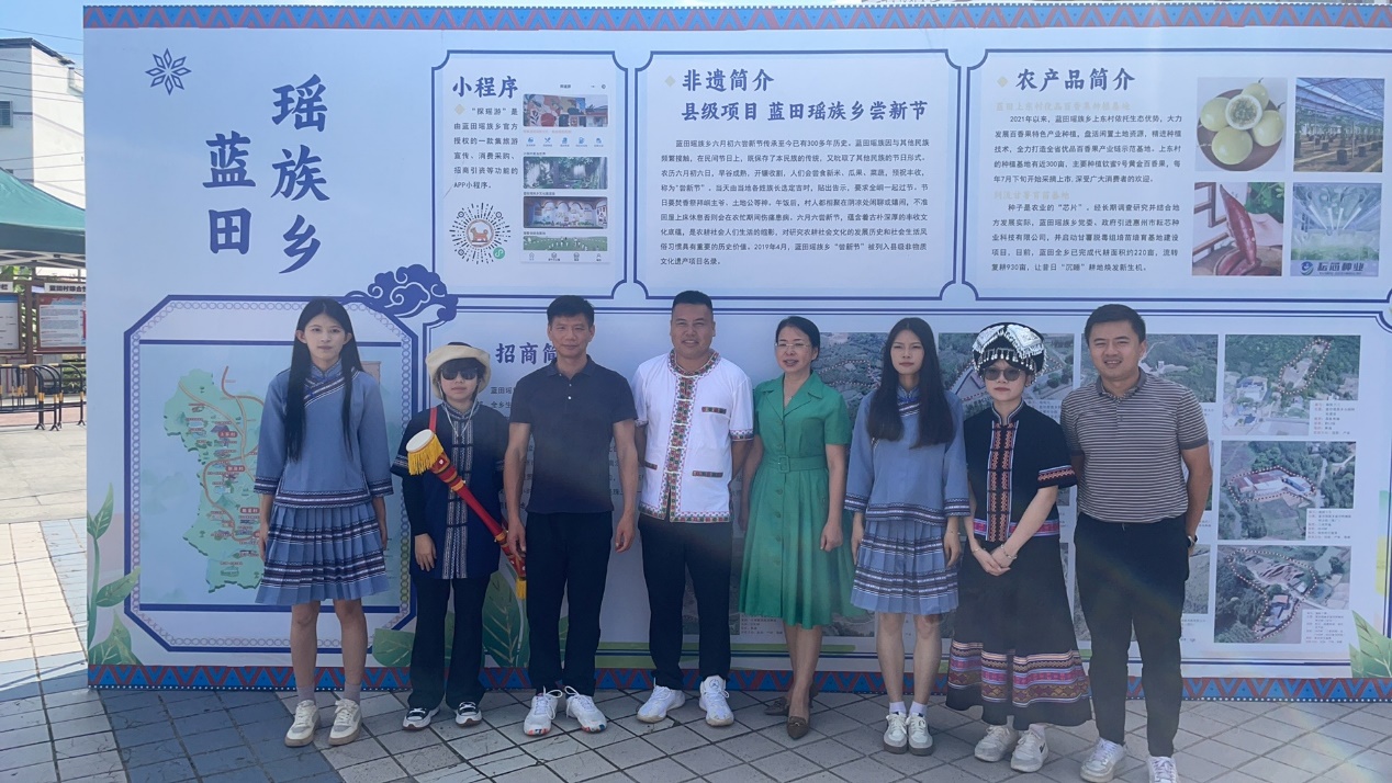在尝新节嘉年华活动现场,外语学院领导代表认真倾听乡企业代表们对蓝田瑶族乡文旅资源和特色农产品的介绍,就如何用新媒体技术助力乡村振兴,加强对蓝田瑶族乡的人才和智力支持与乡企业代表交换了意见。参会嘉宾在尝新节嘉年华活动体验了别具民族特色的瑶族乡文化活动,“青翼”队员将协助当地政企,依托特优农产品和精品旅游路线,共同推动蓝田瑶族乡农文旅融合高质量发展。