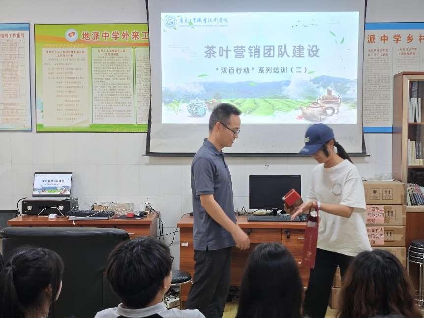 首先,讲师团在茶厂与公司刘仕珍总经理和冯劲松经理进行了茶产业的发展现状、茶产业的发展未来等方面进行研讨。然后,讲师团赴地派中学对员工开展茶产业销售策略培训。李政敏副教授从产茶叶品牌角度开展讲述,黄华乾博士分享了产品销售团队建设的心得,谷少永老师和企业员工探讨了新媒体营销策略选择。