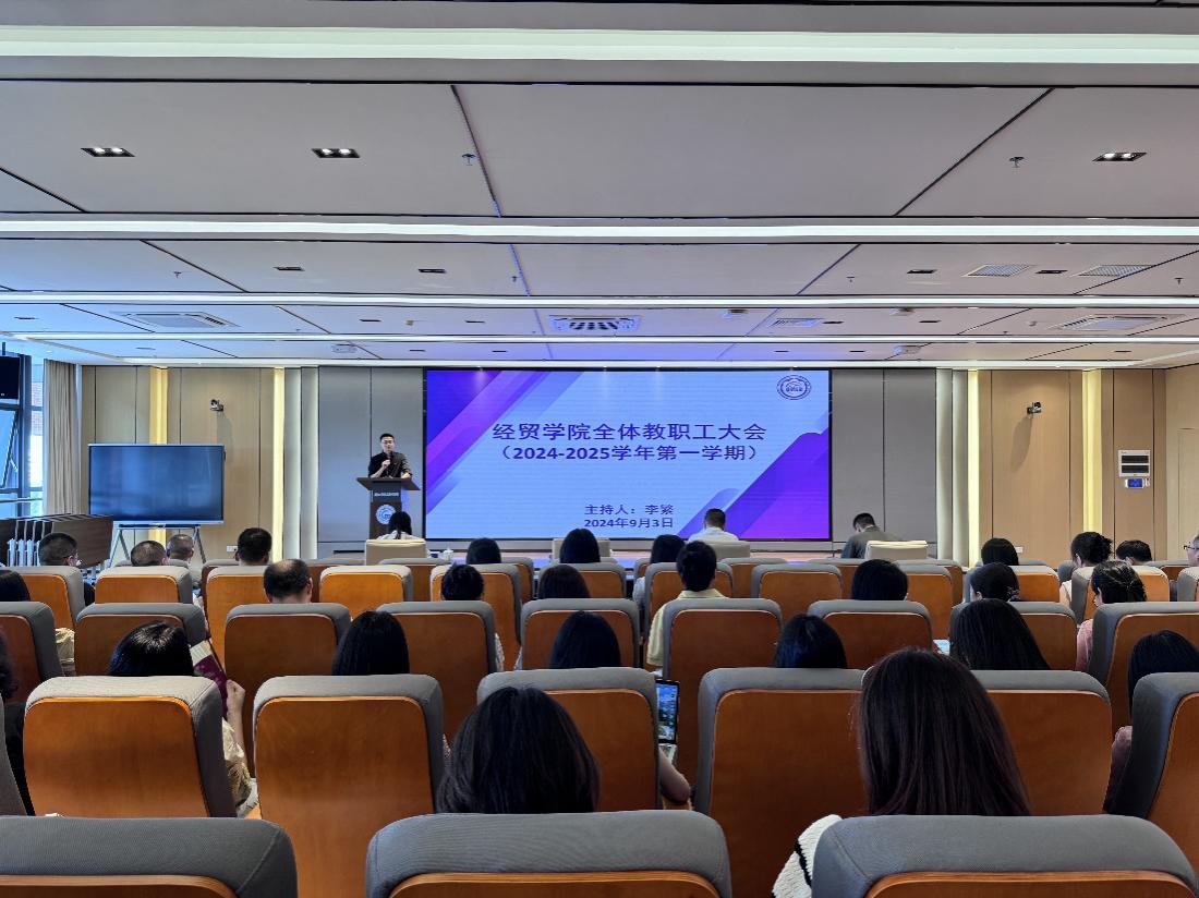为传达学习贯彻中国共产党第二十届中央委员会第三次全体会议精神,围绕高质量发展,在总结上学期工作经验成效和不足的基础上,进一步明晰新学期规划,开新局、谋新篇,确保新学期各项工作有序开展,9月3日下午,经济贸易学院2024-2025学年第一学期全体教职工大会在白云校区图书信息楼629会议室召开,学校党委委员、副校长唐毓秋及经贸学院全体教职工出席会议。会议由经贸学院党总支书记李繁主持。