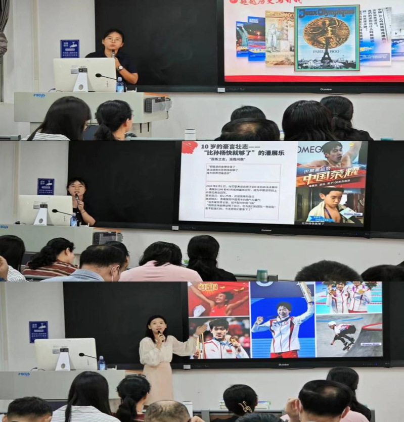 接着开展了“奥运精神融入思政课”教学展示暨研讨活动。首先由许新、辛玲玲和聂心怡三位教师分别就奥运精神融入《思想道德与法治》、《毛泽东思想和中国特色社会主义理论体系概论》课程做了精彩的教学展示。许新老师讲述了中国与奥运、奥运赛场上的00后、中国品牌在巴黎刮起旋风、中国通过奥运向世界展示东方之美、奥运中的法律知识等五个内容,全面挖掘了奥运会中的思政元素;辛玲玲老师深入分析了伟大创造精神、伟大奋斗精神、伟大团结和伟大梦想精神在奥运赛场的具体展现;聂心怡老师从介绍1932年刘长春代表中国第一次参加奥运会的照片入手,通过中国参加奥运历史记录这个缩影,回顾了百年中国的发展历程,巧妙地将奥运精神有机融入到《毛泽东思想和中国特色社会主义理论体系概论》课程内容中。