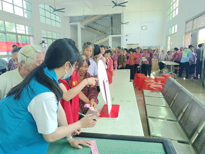 志愿者给村民派发奖品领取凭证