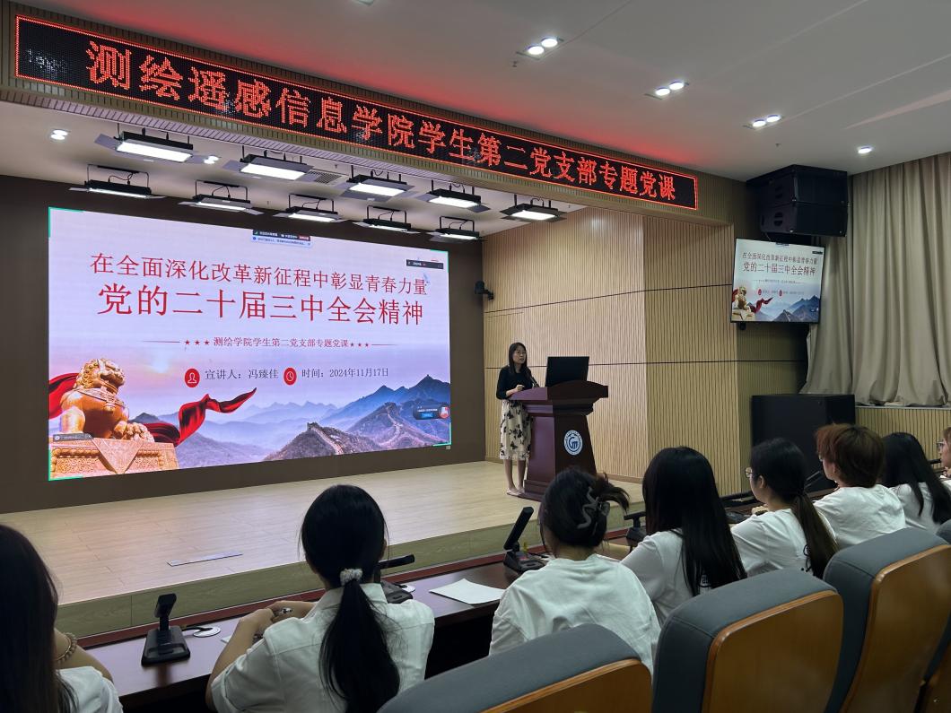 为进一步学习贯彻党的二十届三中全会精神,引导学生党员学思践悟,11月17日晚,测绘遥感信息学院学生第二党支部在博学楼测绘学术报告厅开展了题为“在全面深化改革新征程中彰显青春力量”的党的二十届三中全会精神宣讲活动。宣讲活动以专题党课的形式开展,由专职组织员、支部书记冯臻佳主讲。支部学生党员、发展对象共计34人参加,其中在校外实习的学生党员通过腾讯会议在线上同步参加。
