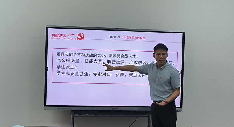 为深入学习贯彻党的二十届三中全会精神,助力实施科教兴国战略、人才强国战略,推动应用外语学院高质量发展,培育出新时代外语专业人才,11月11日,应用外语学院党总支书记罗春科在博学楼610,以“学习贯彻党的二十届三中全会精神,推动外语学院高质量发展”为主题,为外语学院党政班子成员、师生党支部书记和专业带头人带来了精彩生动的党课。