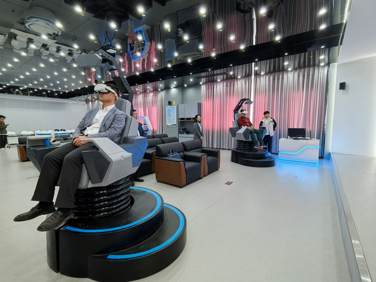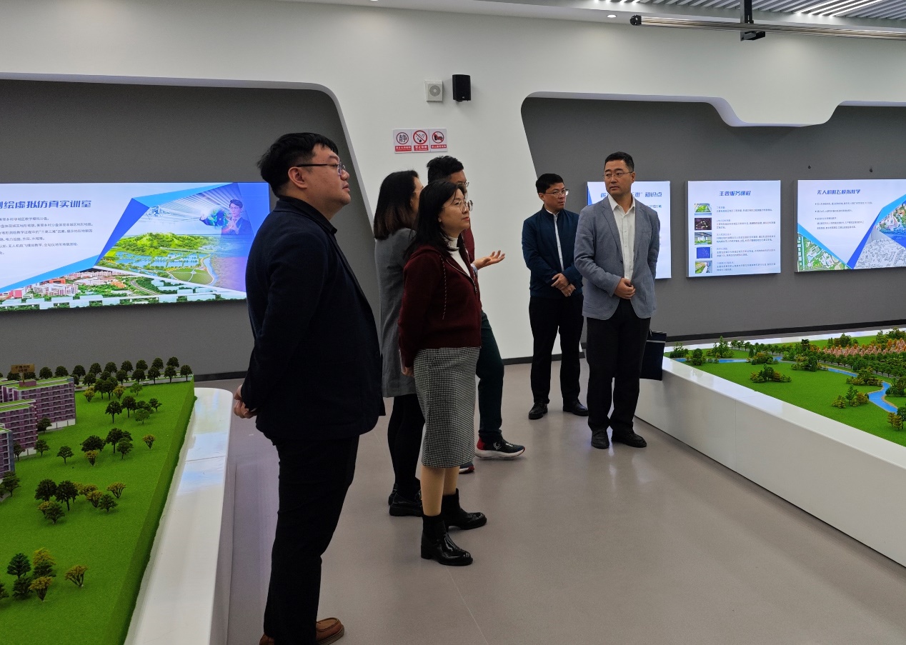 中铁集团的嘉宾们对基地建设的虚拟仿真实训项目表现出浓厚兴趣,亲自体验了遥感技术的沉浸式虚拟仿真体验仓,并与在场师生深入探讨了虚拟仿真技术在实际工程项目中的应用前景。双方主要就地铁变形监测,无人机测绘技术等产学研校企合作内容展开了讨论。