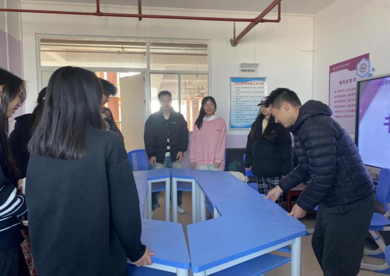 活动开始前,龚云与同学们共同拼接摆放梯形桌,激发同学们的创造性同时营造了轻松愉快的活动氛围。龚云表示,本次座谈旨在倾听同学们的心声,解答疑惑,为大家创造更好的学习和成长环境。