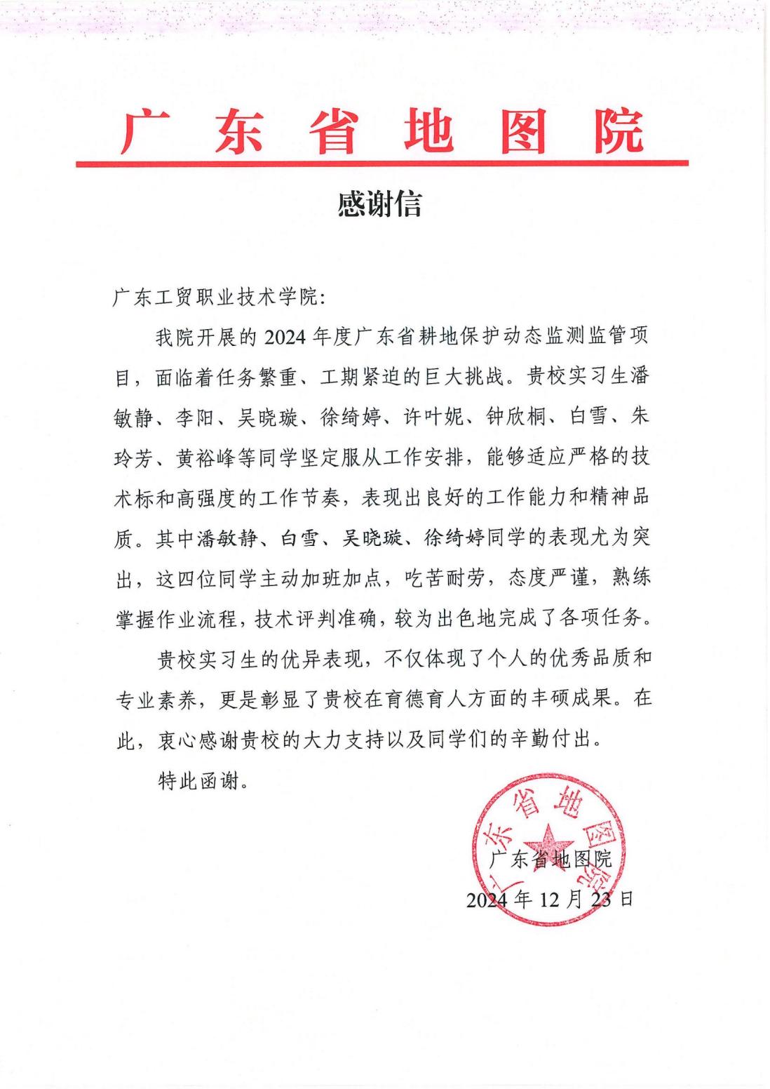 近日,学校收到一封来自广东省地图院的感谢信,感谢学校对省地图院开展的2024年广东省耕地保护动态监测监管项目的大力支持,还对我校测绘遥感信息学院的潘敏静、李阳、吴晓璇、徐绮婷、许叶妮,钟欣桐、白雪、朱玲芳、黄裕峰等9名同学在实习期间的良好表现和辛勤付出表示肯定和感谢。