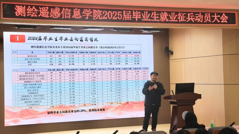 陈君浩对测绘学院2024年就业征兵工作情况进行总结。他指出,测绘学院2024届毕业生毕业去向落实率位列校本部第一,这些成果离不开学院全体师生的共同努力,希望接下来全院师生能够担当作为、攻坚克难,推动2025届毕业生就业工作再上新台阶。与此同时,陈君浩对学院的征兵工作情况进行汇报,他鼓励同学们踊跃报名参军,为国家的繁荣富强贡献自己的力量。