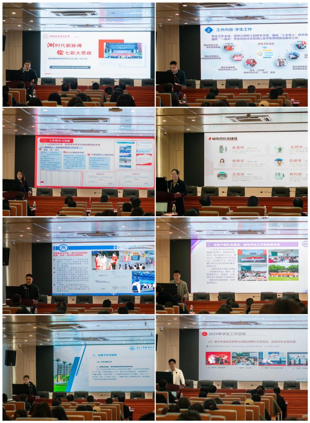 会议伊始,由计算机与信息工程学院党总支书记张宁致欢迎辞。学生工作部部长和创新创业学院直属党支部书记立足工作内涵,分别对 2024 年学生工作进行了总结汇报,并提出2025年度总体思路。各学院副书记围绕落实学生工作要点汇报了工作举措、育人实效和特色亮点,分析短板不足,明确工作方向。