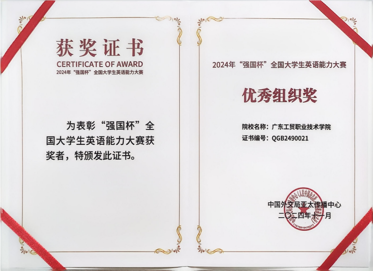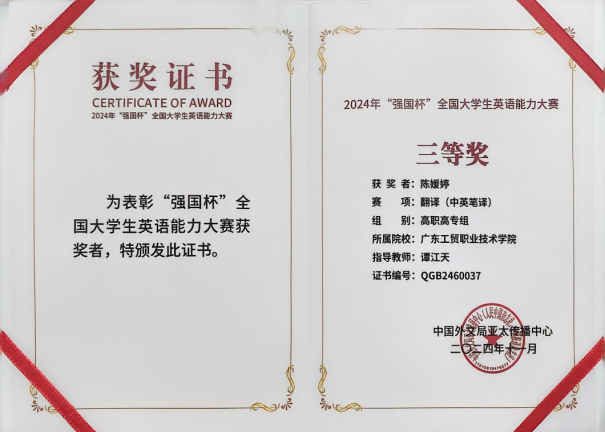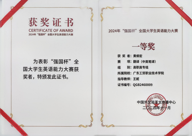 在由中国外文局亚太传播中心主办、广东省翻译协会协办的2024“强国杯”全国大学生英语能力大赛中,我校学子凭借深厚的英语功底、卓越的表达能力以及宽广的国际视野,在激烈的竞争中脱颖而出,斩获全国一等奖两项、二等奖两项及三等奖四项的骄人成绩。