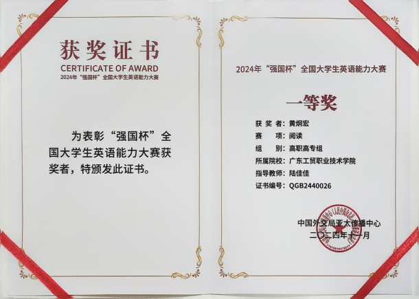 本次大赛旨在全面增强国际传播效能,培育一支适应新时代国际传播需求的高素质人才队伍。我校学子在此次大赛中的卓越表现,不仅彰显了个人在英语领域的杰出才能和综合素养,也充分展现了我校在英语教学和人才培养方面取得的显著成就。其中,我校学生黄炯宏凭借优异的表现,荣获中英笔译比赛一等奖和阅读比赛一等奖(指导教师:陆佳佳、王妮);林思淇荣获英中笔译比赛二等奖(指导教师:雷莹);值得注意的是,黄炯宏还再次荣获英中笔译比赛二等奖、英语写作三等奖、英语语法三等奖(指导教师:陆佳佳)。同时,陈媛婷(指导教师:潭江天)、张桂烨(指导教师:王妮)分别在翻译、词汇项目中荣膺三等奖。我校学子在此次大赛中的出色表现,展现了我校学子在多个英语技能领域的全面实力。不仅充分展示了我校在英语教学与国际传播教育领域的深厚积累,更为未来国际传播人才的培养提供了宝贵的经验和有益的借鉴。