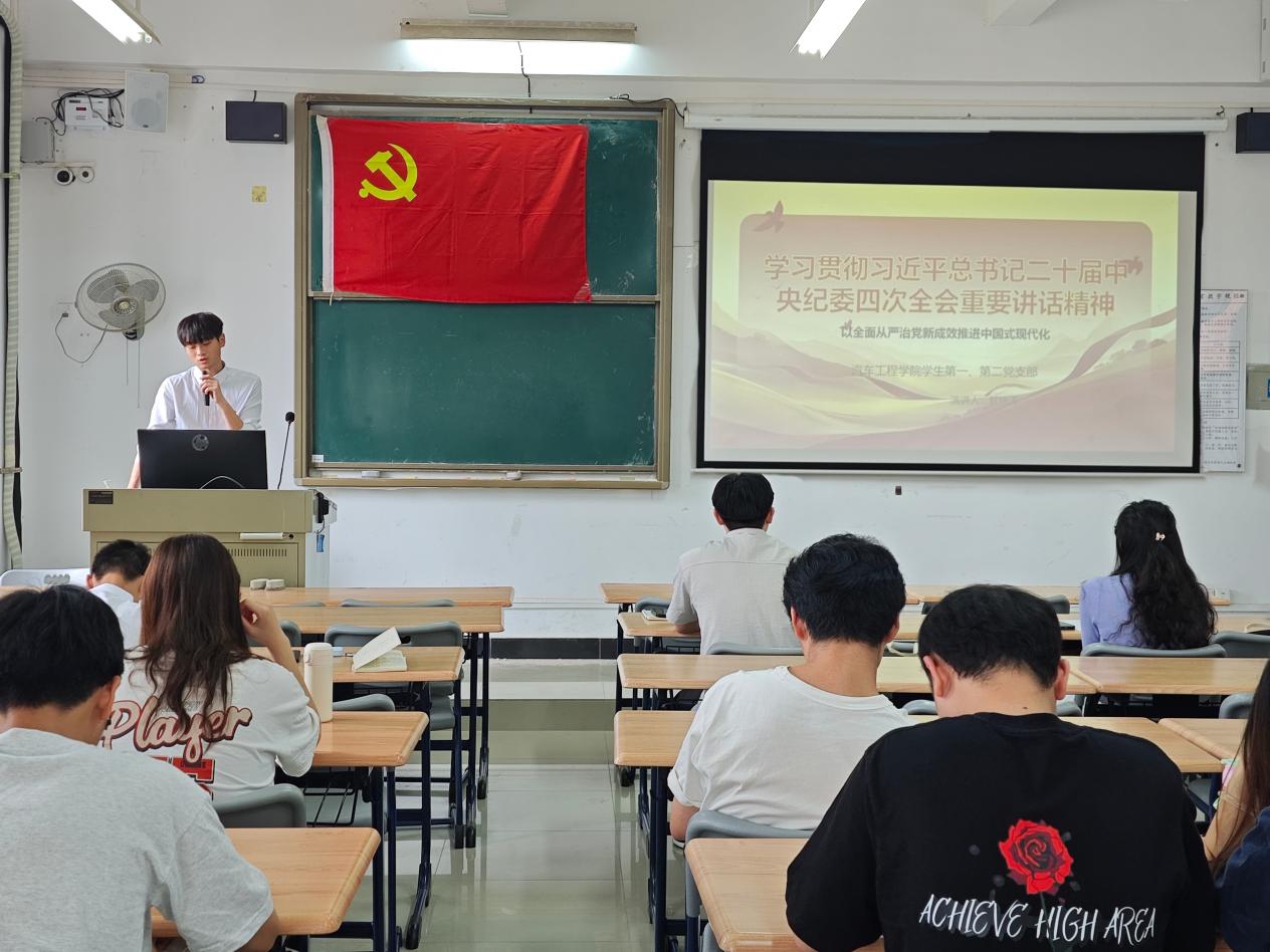 为进一步学习贯彻习近平总书记在二十届中央纪委四次全会上的重要讲话精神,深刻牢记以全面从严治党新成效推进中国式现代化,以党史为镜,深学笃行全面从严治党新要求,汽车工程学院学生第一、第二党支部于2025年4月10日下午在明徳楼1-312召开党史学习教育微课堂之学习贯彻习近平总书记在二十届中央纪委四次全会上的重要讲话精神,学生第一、第二党支部全体在校党员参加会议。会议由陈碧娴主持。