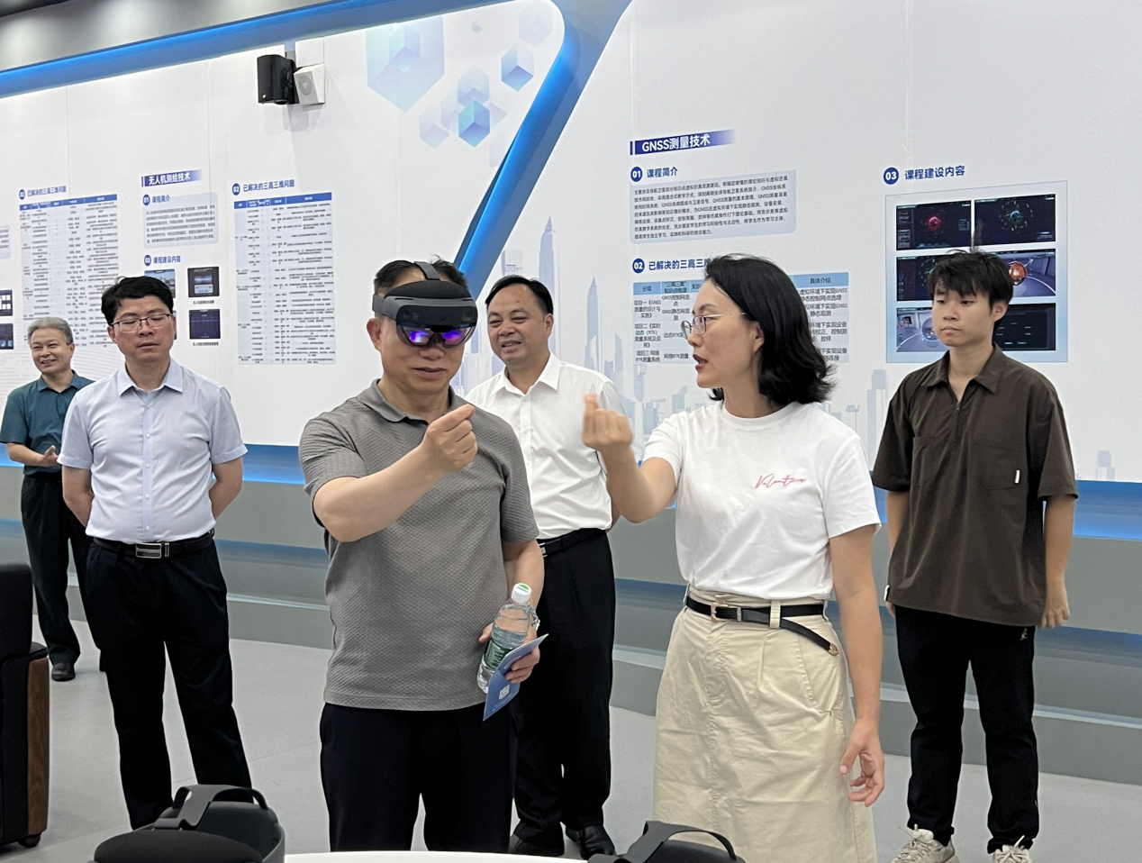 杨金华书记一行实地走访了测绘新技术训练实训室、地形地貌与无人机航测模拟实训室、工信部校企协同就业创业创新实践示范基地、虚拟仿真实训中心等教学科研场所。参观过程中,来访嘉宾沉浸式感受我校专业群建设的特色成果,深入了解人工智能技术在教学、科研和管理中的创新应用。对于我校在数字化教学资源整合、虚拟仿真实验平台建设及智能化教育管理方面的实践成效,来访嘉宾给予高度赞誉,现场交流氛围热烈。