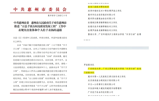 7月21日,中共惠州市委、惠州市人民政府发布通报,对推进“百县千镇万村高质量发展工程”(以下简称“百千万工程”)工作表现突出的集体和个人予以表扬。我校“双百行动”驻龙门县服务队荣获“工作表现突出集体”,彰显了学校在服务地方经济社会发展中的责任担当与工作成效。
