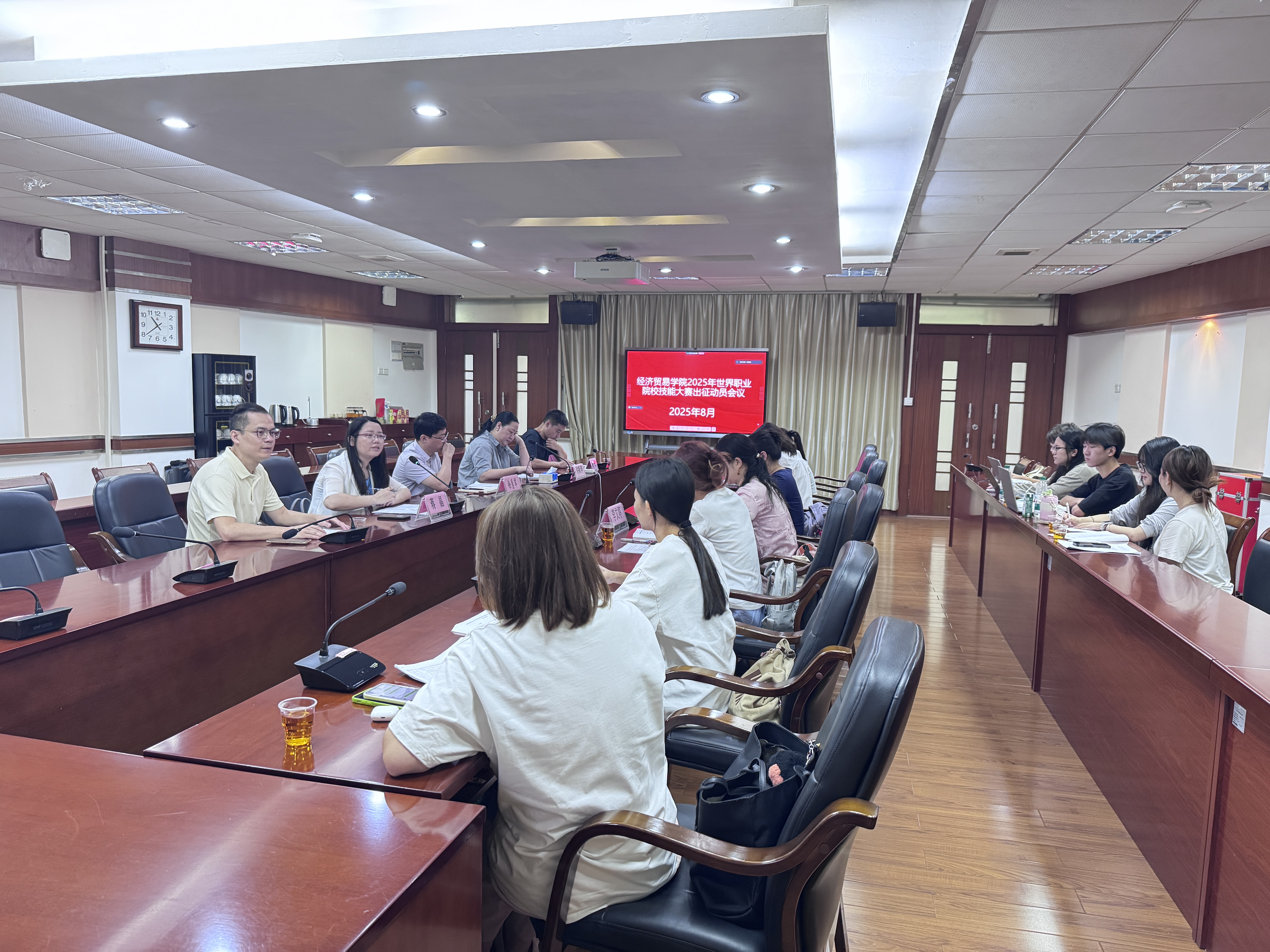 2025年8月15日上午,经贸学院在天河校区西区中心会议室召开2025年世界职业院校技能大赛出征动员会。经贸学院领导班子成员及入围世赛项目的师生团队参加会议。会议由经贸学院院长蒋晶主持。