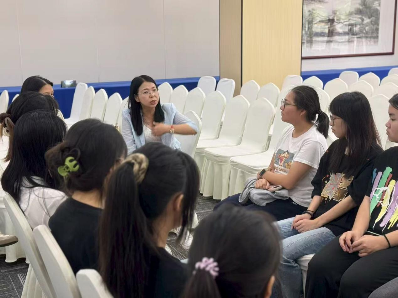 典礼结束,彭院与苏院特意组织12名学生进行座谈,亲切询问他们的实习准备情况,“有没有梳理好自己的英语专业技能?对轮岗岗位有什么期待?”一句句关切的提问让学子们倍感温暖。学生们纷纷表示,会牢记院长嘱托,在实习中认真学习、积极实践。最后,彭枚芳向12名实习学子提出三点期望:一是做“主动学习者”,珍惜与企业导师共事的机会,把外语优势转化为岗位竞争力;二是做“创新实践者”,关注低空经济、保税医药等空港新赛道,探索“多语种+跨境服务”的创新路径;三是做“全面发展者”,在团队协作中提升沟通能力,完成从“学生”到“职业人”的蜕变。