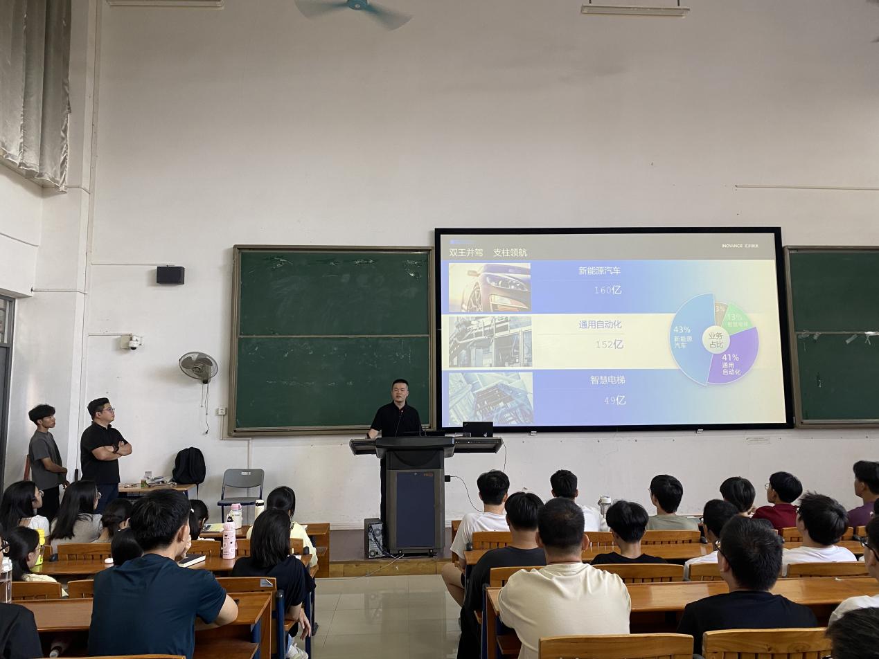 随后,汇川技术华南战区教育总监吴振东详细介绍了汇川技术的发展历程、行业地位和人才需求现状。他重点解读了“汇川汇英班”的三大特色:一是聚焦锂电装备制造业,精准对接行业人才需求;二是依托国内龙头企业资源,开展实景化教学,提升学生实践能力;三是提供全方位资源保障,包括设立专项奖学金、竞赛指导、就业推荐等。他还鼓励同学们在大一上学期夯实专业基础,为下学期班级选拔做好准备。