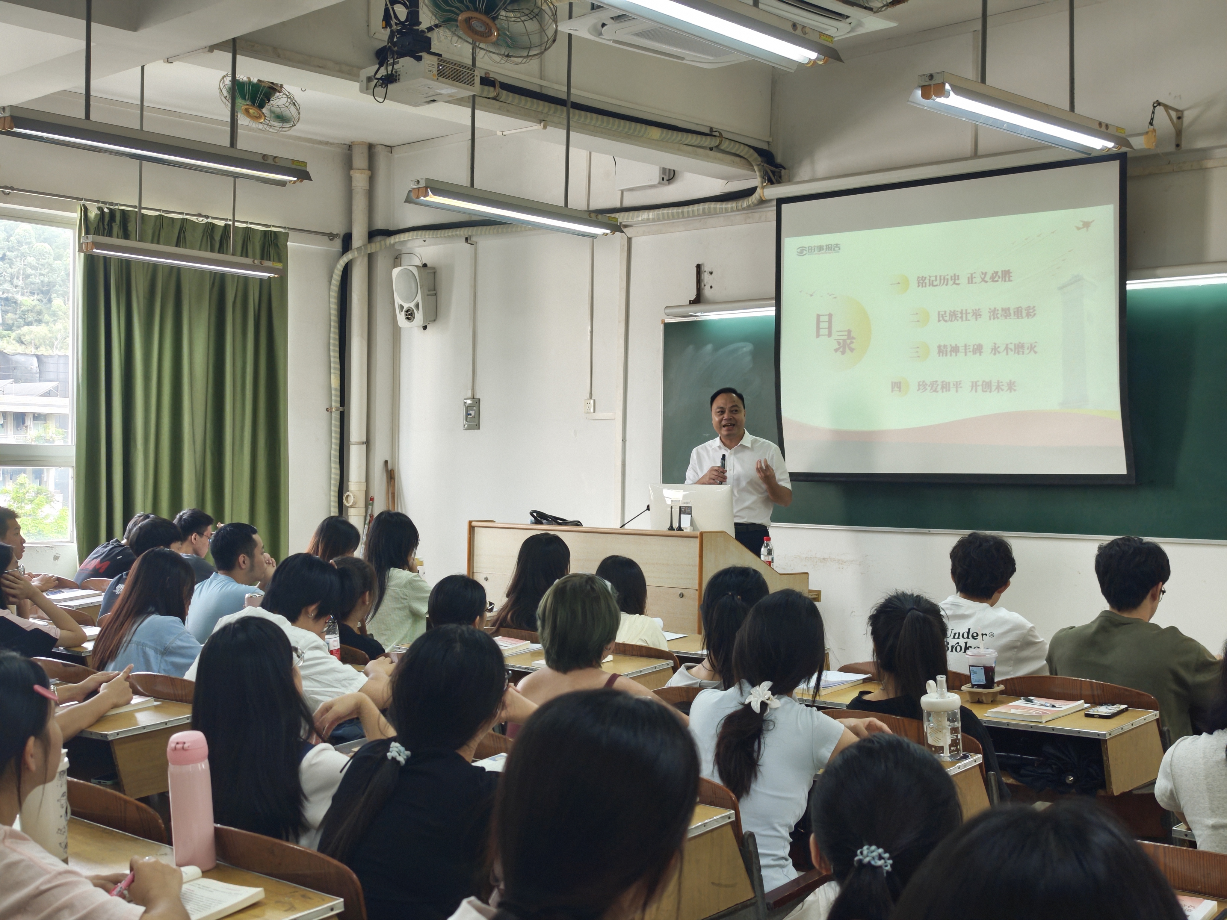 2025年9月18日上午,结合“九一八”事变爆发94周年纪念日这一重要时间节点,学校党委副书记揭英荣围绕“纪念抗战胜利 坚定民族信念”主题,在天河校区综合楼502室为2024级媒体3班的学生讲授了一堂深刻而富有教育意义的思政课。