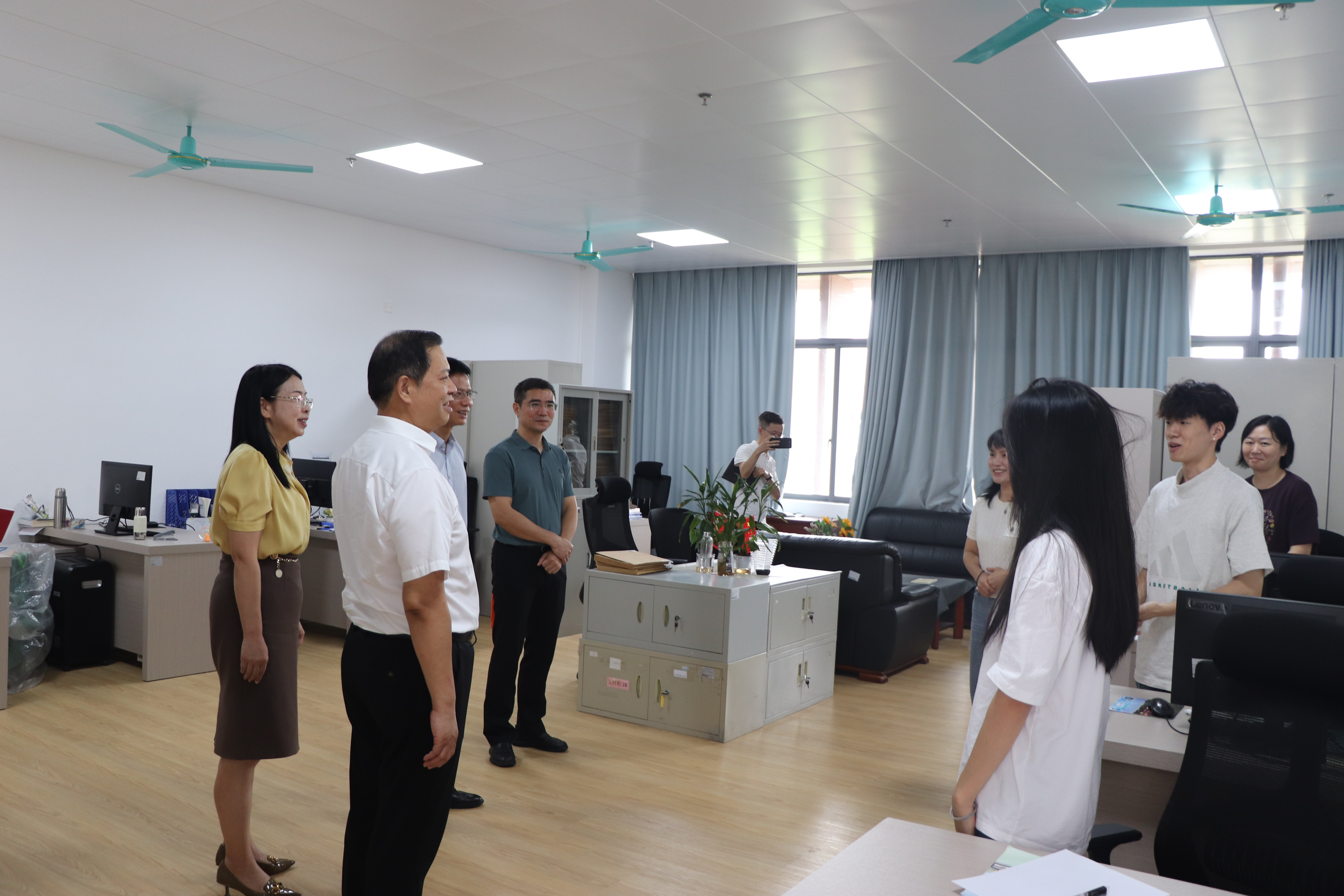 在第41个教师节即将来临及新学期开启之际,9月9日上午,学校党委书记何汉武深入应用外语学院,亲切看望慰问一线教职员工,向大家致以节日的诚挚祝福,并就学院高质量发展召开座谈会。党委委员、党政办公室主任吴浩陪同。