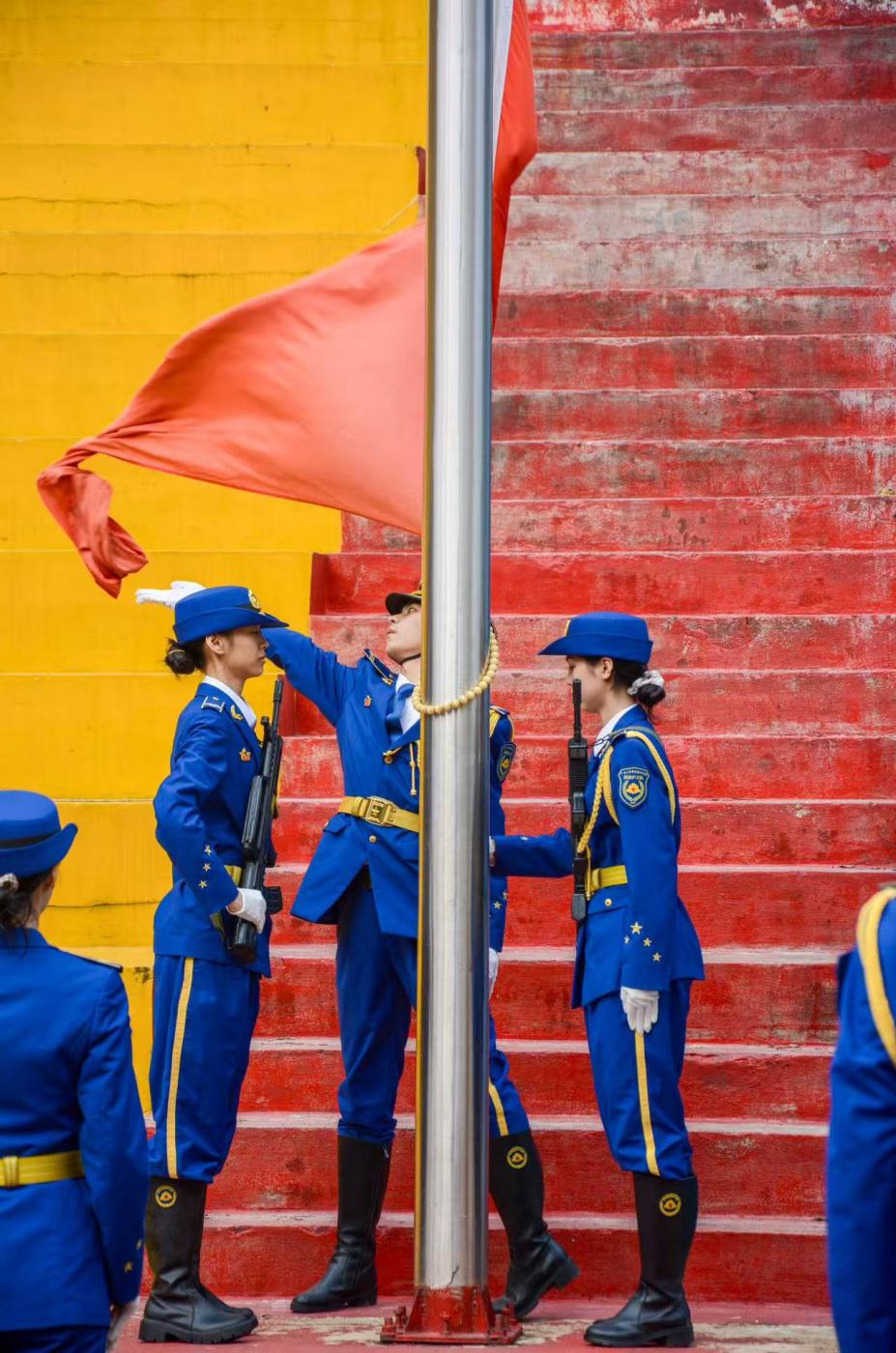 国旗护卫队护送国旗走向升旗台并升起国旗