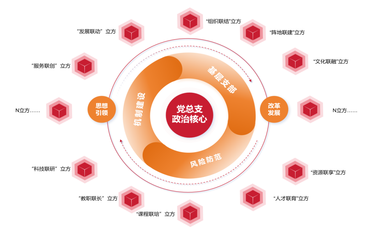 在专业群建设中,学院坚持以党建为引领,积极对接“一体两翼五重点”,学院党总支形成“一心双环N立方”的党建工作模式,“一心”指强化党总支的政治核心作用,突出对专业群建设中的示范引领与带动,推动师生党员凝心聚力助推专业群优质发展;“双环”旨在进一步推进机制建设、基层党支部、风险防范、思想引领、改革发展“五个到位”,形成党建工作内外双循环,进一步拓展党建引领事业发展能力,推动师生党员攻坚克难突破建设中的重点任务。“N立方”是在“一心”“双循环”基础上,透过党建引领,进一步突出与政府、行业、企业等的联合,形成人才培养、课程建设、实训基地、社会服务等N个四维立方体,破解“产教融合、科教融汇”中遇到的“中梗阻”,进一步助推产业变革升级。