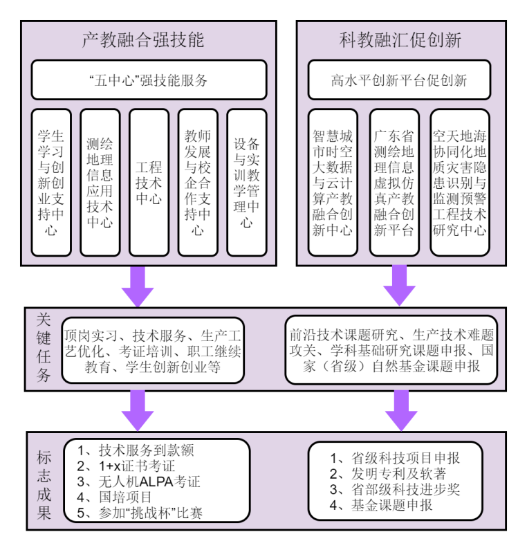 专业群搭建科教融汇的有效载体,成立“五个中心”及高水平创新平台,促进多学科专业交叉融合,打破科教分离的藩篱。①成立“五个中心”,产教融合强技能,面向粤港澳大湾区测绘地理信息行业和企业需求,组建测绘地理信息应用技术中心等五个中心,形成校企沟通桥梁;围绕服务国家测绘地理信息重点行业、乡村振兴、粤港澳大湾区建设和中小微企业发展,以应用研究为主攻方向,承接社会服务项目;依托无人机测绘技术优势专业,聚焦智慧城市时空大数据、实景三维等高新关键技术,打造粤港澳大湾区测绘新技术培训交流高地、华南地区“1+x”证书管理中心、建立无人机AOPA、ALPA培训中心。②搭建“创新平台”,科教融汇促创新,瞄准粤港澳大湾区测绘地理信息产业转型升级过程中的前沿技术难题,共建高水平产教融合创新平台;以智慧城市时空大数据智能服务与融合应用、实景三维建模技术与应用和地质灾害监测预警为研究方向建设创新中心、研究中心助力区域经济转型升级;打造高水平科技团队,聚焦实时动态环境的高精度虚拟建模及智能化交互技术,破解测绘地理信息模型快速重建、突发事件的动态应急响应等“卡脖子”难题。