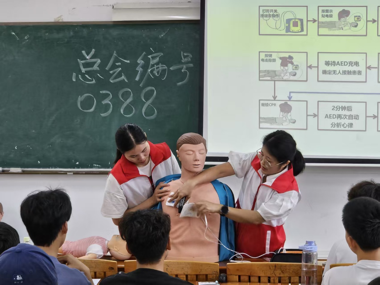 随后,培训重点聚焦心肺复苏(CPR)和AED的正确操作。在心肺复苏急救知识培训方面,授课老师以心搏骤停的急救紧迫性为切入点,明确“黄金4分钟”的关键意义,并围绕成人心肺复苏操作,详细讲解具体流程。同时,针对儿童与婴儿心肺复苏的特殊性,老师进行特别对比与讲解。在AED正确使用培训方面,老师指出,AED是中止心室颤动、无脉性室性心动过速等致命性心律失常的唯一有效手段,她结合实物演示与语音提示,分步讲解操作流程,示范具体操作步骤。同学们认真记录要点,在老师的指导下分组进行假人心肺复苏与AED的模拟操作,在实操练习中巩固所学。老师也鼓励大家在遇到紧急情况时要敢于施救、科学施救。