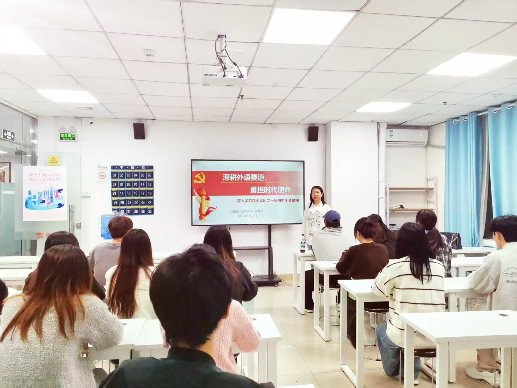 为深入学习贯彻党的二十届四中全会精神,推动全会精神在基层教学一线落地生根,12月2日,应用外语学院院长彭枚芳前往深圳校外教学点,为24级商务英语专业(现代学徒制班)的全体师生讲授了一堂生动而深刻的专题党课。