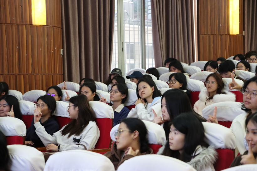 随后,讲座揭秘情绪生理机制,用“情绪脑(杏仁核)”与“理智脑(前额叶)”的互动原理,解释压力下情绪失控的原因,并带领全场体验“4-7-8呼吸法”(吸气4秒、屏息7秒、呼气8秒),通过刺激副交感神经实现快速舒缓,学生反馈“三分钟练习后心跳平缓、身体放松”。