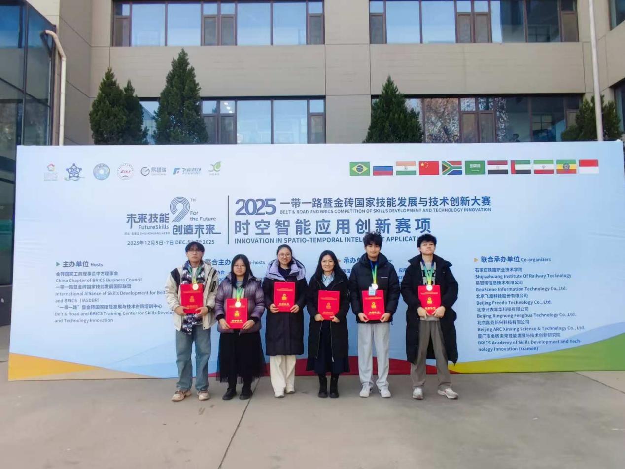 12月6日,2025年一带一路暨金砖国家技能发展与技术创新大赛之时空智能应用创新赛项国内赛决赛在石家庄铁路职业技术学院成功举办。本次大赛吸引了来自全国多所985、211重点本科院校及高职院校的师生同台竞技,竞争激烈。在学院领导和实训中心的大力支持下,测绘学院师生积极备赛、迎难而上。最终,在教师组的角逐中,常德娥荣获三等奖,吴萍昊荣获优秀奖。学生组方面,由张瑜、刘焕、朱志航、麦润殷同学组成的队伍(指导教师:常德娥、巢子豪)荣获高职组二等奖;由廖雪彤、莫志程、何俊熙、吴森城同学组成的队伍(指导教师:吴萍昊、邱献引)荣获高职组三等奖。