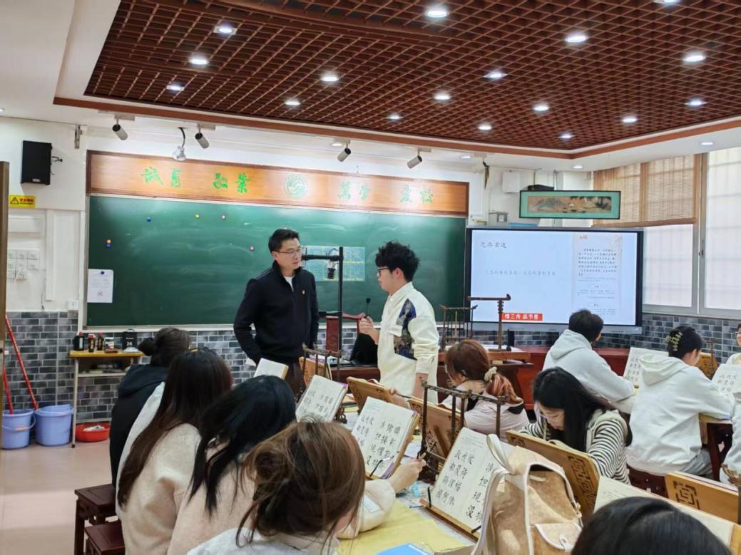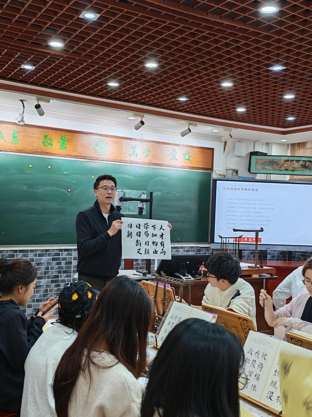 为让阅读分享更具感染力,现场特别设置了书法实践环节。李繁带领同学们挥毫泼墨,将总书记勉励青年的 “人才有高下,知物由学”“苟日新,日日新,又日新”等古语落到宣纸上。同学们凝神聚力,或笔力遒劲,或清秀雅致,在笔墨流转间体悟经典内涵与全会精神的共鸣,现场墨香氤氲、气氛热烈。