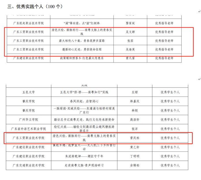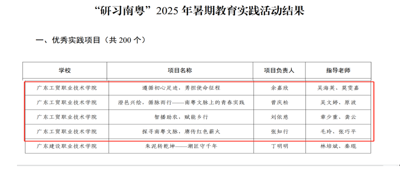 近日,我校在2025年暑期社会实践省级评选中捷报频传,接连获得共青团广东省委员会和广东省教育厅的通报表彰,成果丰硕,充分展现了我校实践育人工作的显著成效和工贸学子奋发有为的青春风采。