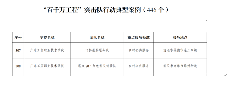 典型案例:经济贸易学院“飞扬基层服务队”(指导老师:吴海英、莫雯嘉、龚云)和马克思主义学院“薪火80·红色韶关筑梦队”(指导老师:张容、李爽、俞雪娇)双双获评“百千万工程”突击队行动典型案例。两支团队均以乡村公共服务为核心,深入基层一线,或助力民生改善,或传承红色基因,获得了广泛认可。