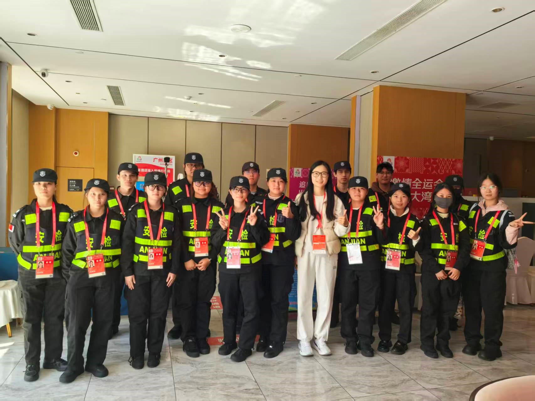 岗位工作熟悉之后,最具考验的是“坚持”。早班,每天5:30前起床洗涮,6点准时出发;中班,煎熬的是运动员及工作人员、技术官员往往成批到达场所(场馆),安保工作量大、任务重,回到学校已是凌晨;晚班,最困难的莫过于作息颠倒。而到换班时段,中班、晚班的同学休息时间前后不到5个小时。11月19日,广州骤然降温,“车检”岗位的同学轮流穿着安保公司配发的保暖大衣,互相打气,坚守岗位。现场值守的市总保带队干警动情地跟指导老师竖起了大拇指,“天气这么冷,你们学生很不错!”