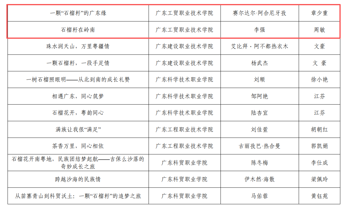 近日,广东省教育厅主办的2025年“爱在广东”民族团结进步教育活动结果正式公布。师生凭借扎实的创作功底与深厚的民族情怀,斩获多项奖项。其中,在“相遇广东”主题演讲活动中,共获一等奖1项,三等奖2项;在“相融广东”微视频活动中,获一等奖1项。这些获奖作品,生动体现了各民族学子同心相融的美好图景,也展现了学校铸牢中华民族共同体意识教育的丰硕成果。