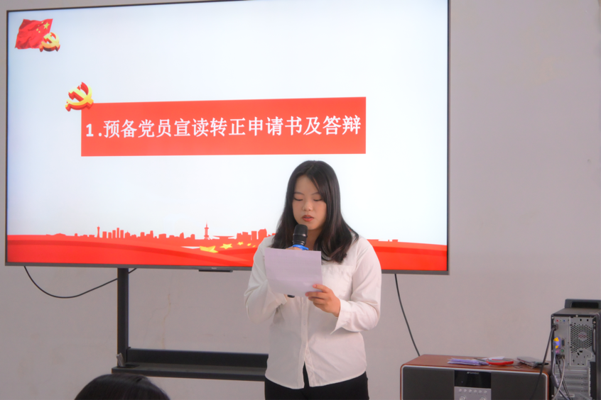随后,王晓庆等8名预备党员依次宣读《转正申请书》并接受现场答辩。他们结合预备期内的成长经历,从思想淬炼、专业学习、工作实践、服务群众等方面进行了详细汇报,充分展现了在政治素养、能力本领、作风形象上取得的进步,彰显了坚定的理想信念与不断提升的党性修养。大家一致表示,今后将始终心系群众,用心用情为身边同学解决问题;坚持用党的创新理论武装头脑、指导实践,充分发挥先锋模范作用,努力成长为党性坚强、作风过硬的合格党员。