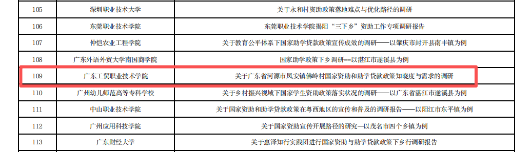 我校工商管理学院《关于广东省河源市凤安镇佛岭村国家资助和助学贷款政策知晓度与需求的调研》、经济贸易学院《惠州市龙门县山下村村民对国家资助和助学贷款认知与参与度调研》、艺术与教育学院《关于南昆山地区国家资助和助学贷款政策普及情况的调研》三篇报告获评优秀调研报告;工商管理学院谢宏祥书记、经济贸易学院章少重老师获评优秀指导老师;经济贸易学院谢湘同学、艺术与教育学院胡思情同学获评优秀实践队员。