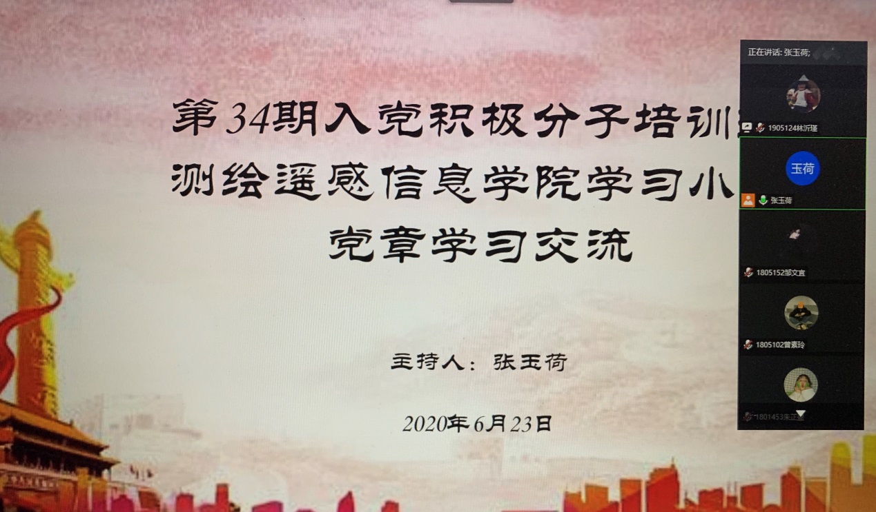 623日晚20点,测绘遥感信息学院党总支组织第34期入党积极分子培训班的本学院学员开展党章学习交流。活动通过腾讯会议平台线上开展,由测绘学院学生第一党支部书记张玉荷主持,学院共61名入党积极分子进行了学习交流。