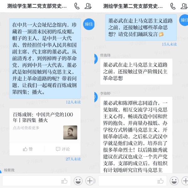 4月15日晚,测绘遥感信息学院学生第二党支部开展“党史微课”系列活动,组织全体党员通过学习强国平台学习观看了百集微纪录片《百炼成钢:中国共产党的100年》第四集:播火,并进行了观后感交流讨论。本次党课由支部书记冯臻佳老师主持、主讲。