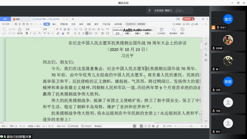2021年8月18日,测绘遥感信息学院教师第二党支部在腾讯会议召开党史学习会议,学习习近平总书记在2020年10月23日发表的《在纪念中国人民志愿军抗美援朝出国作战70周年大会上的讲话》。会议由党支部书记黄铁兰老师主持,支部全体党员老师共同参加学习。